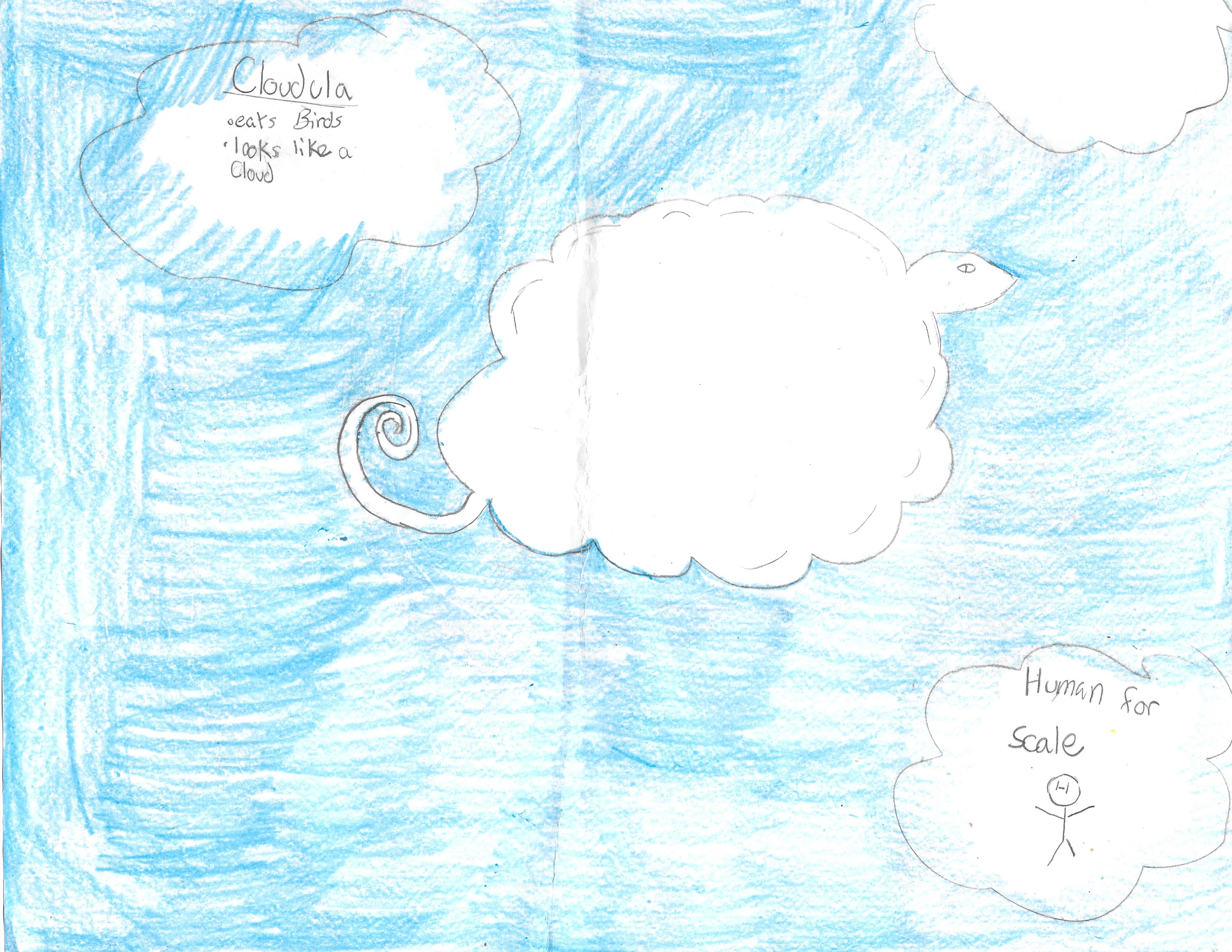 The Cloudula looks very much like a cloud. This is how they hide from humans and other predators. They don't eat much. They feed on actual clouds. Humans actually classified them as cumulus clouds. If you see a bunch of cumulus clouds, it's a flock of these peaceful creatures. If humans knew they existed, they would classify them as marsupials.