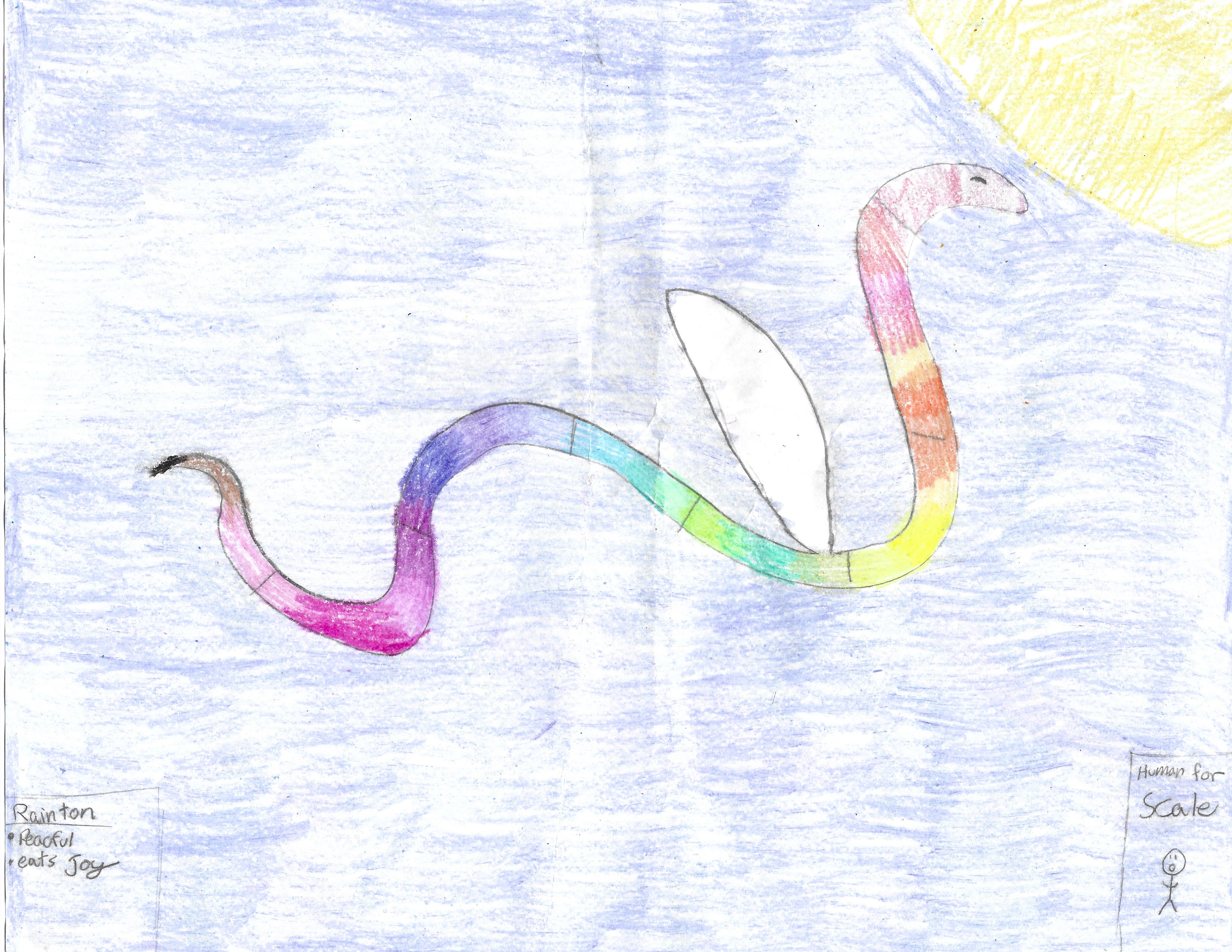 Raintons are the leaders of the Air Mythocreatures. They have a lot of magic. Raintons are responsible for the rainbows that appear on earth. Their scales are colored in a rainbow pattern, adding magenta, pink, brown and black. They can use their wings to send bright lights and defend themselves. Babies are born with a dull black. There is no distinction between males and females except the females carry the child.